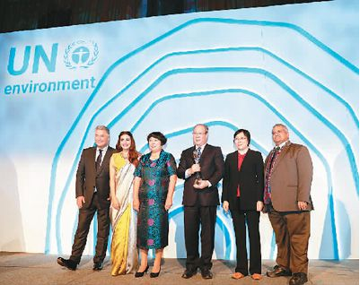 北京時間2018年9月27日,浙江省「千萬工程」榮獲聯合國「地球衛士獎」中的「激勵與行動獎」。圖為頒獎現場。