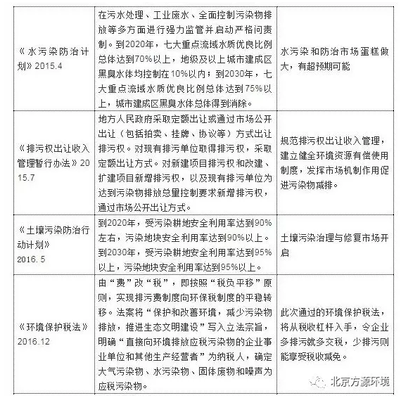 環保行業對於政策比較依賴。近年來,以「三大計劃」為引領,政府多個環保政策相繼出台,並且發佈了一系列的十三五子行業環保規劃,每個規劃或計劃涉及的投資都是成千上萬億。正是由於未來龐大的市場开展空間,吸引了資本關注。